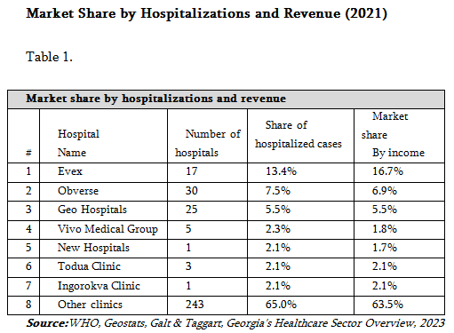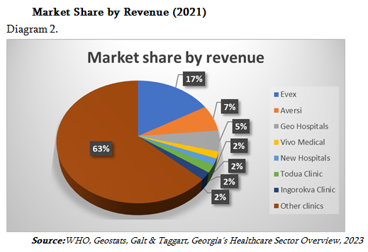 • Private investment accelerated following the 2007 wave of hospital privatizations. According to the National Statistics Office of Georgia (GeoStat, 2023), private healthcare investment grew at an annual rate of 8–10% between 2015 and 2022, with a strong concentration in Tbilisi and select regional centers. Foreign investors from Turkey, Israel, and Gulf countries have entered the market, primarily targeting high-margin specialties such as cardiology, oncology, and fertility services.