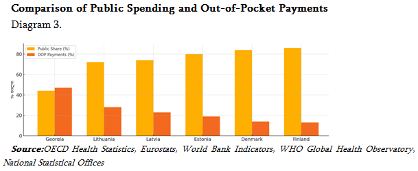 Comparative analysis indicates that Georgia’s healthcare sector demonstrates a moderate level of financial activity. However, the allocation and structure of these resources differ markedly from the more effective systems seen in the Baltic and Scandinavian models (see Diagram #3).