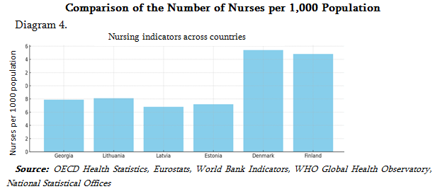 Georgia’s nurse ratio stands at 7.9 per 1,000 population, which is significantly lower than in Scandinavian countries (Denmark – 15.4, Finland – 14.8) and slightly below the Baltic average of 7.3. This disparity highlights an imbalance in the nurse-to-doctor ratio: Georgia has only 1.8 nurses per doctor, whereas Scandinavian countries maintain a ratio of approximately 3.5 to 4. The shortage of nurses in Georgia hampers service continuity, compromises care quality, and places excessive workload on physicians.