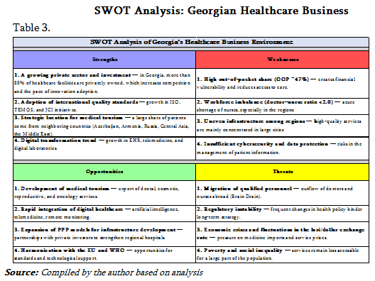 In summary, the literature suggests that Georgia’s healthcare business sector stands at a strategic inflection point. The coming decade will be shaped by the country’s ability to adopt international best practices, secure sustainable financing, and align policy incentives with both investor priorities and public health objectives.