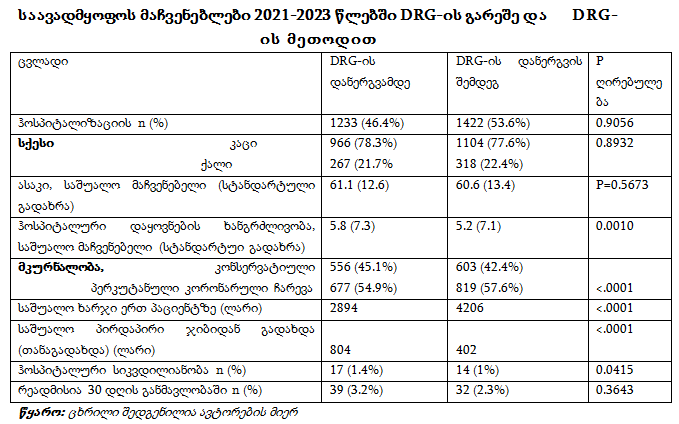 ცხრილი გვიჩვენებს შერჩეული პოპულაციის საბაზისო მახასიათებლებს. რეფორმამდე პერიოდში (2021 წლის მაისიდან 2022 წლის ნოემბრამდე) მიოკარდიუმის ინფარქტით დაავადებულთა რაოდენობა შეადგენდა 1233-ს, ხოლო რეფორმის შემდგომ პერიოდში (2022 წლის ნოემბრიდან 2024 წლის მაისამდე) – 1422-ს. DRG-ის ანაზღაურების შემოღების შემდეგ, ჰოსპიტალიზაციის რაოდენობა 15,3%-ით გაიზარდა. პაციენტების საშუალო ასაკი შეადგენდა 61 წელს.